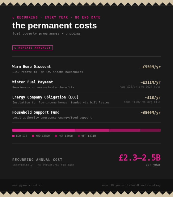 The UK spends another £2.5B every single year on the permanent infrastructure of fuel poverty: schemes that exist because energy is structurally unaffordable for millions of households. It has also committed £17-18B over 5 years to make homes more efficient.